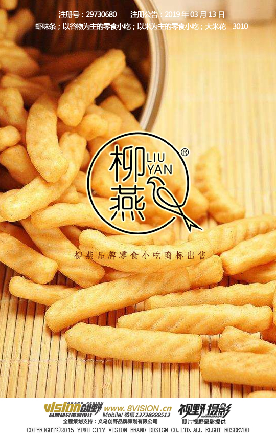 金华30类R图文商标出售《柳燕》虾味条;以米为主的零食小吃大米花/义乌商标注册转让