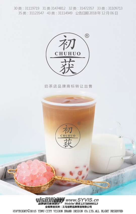 《初获》初,指的是最初,初次;获,指的是收获;对于农民来说,他们一年四季都在辛勤耕种,而秋天便是他们感到最幸福的季节,因为那是收获的季节,承载的是满满的粮食的香甜,幸福的味道,收获的味道。初次收获是价值最高的时候,营养价值极高。初获这一品牌也源于此,适合用于餐馆、酒水、谷物制品、奶茶、化妆品等
